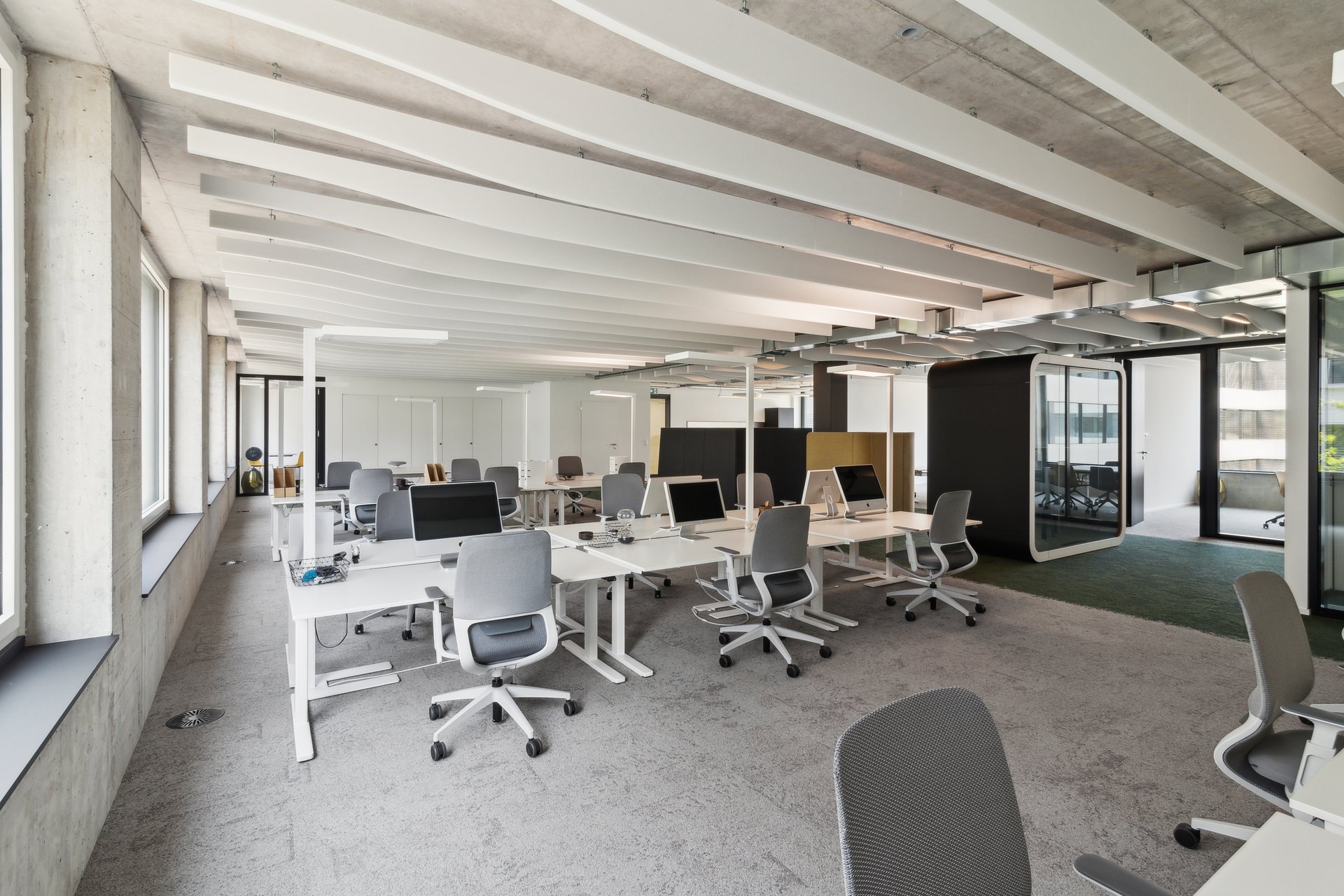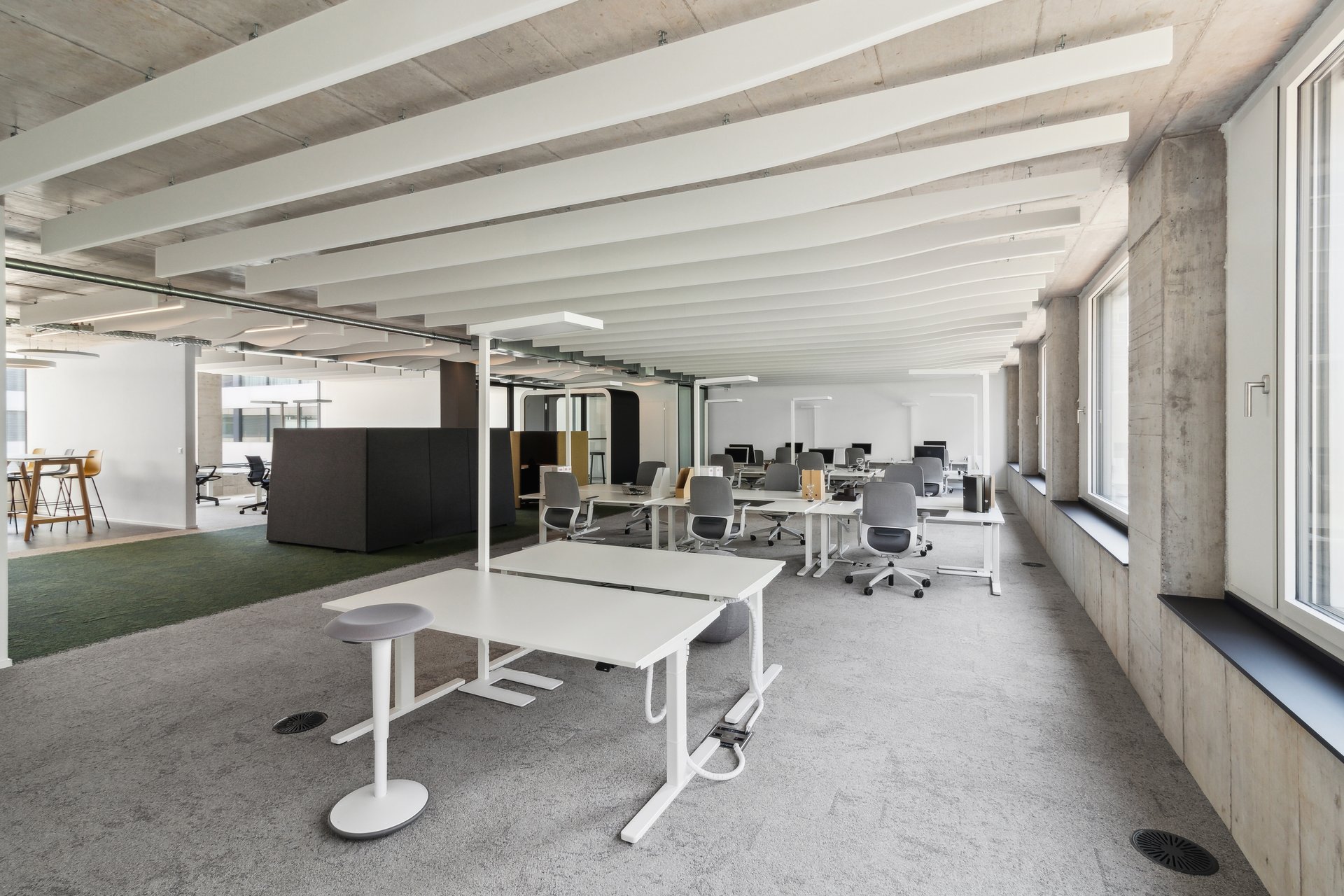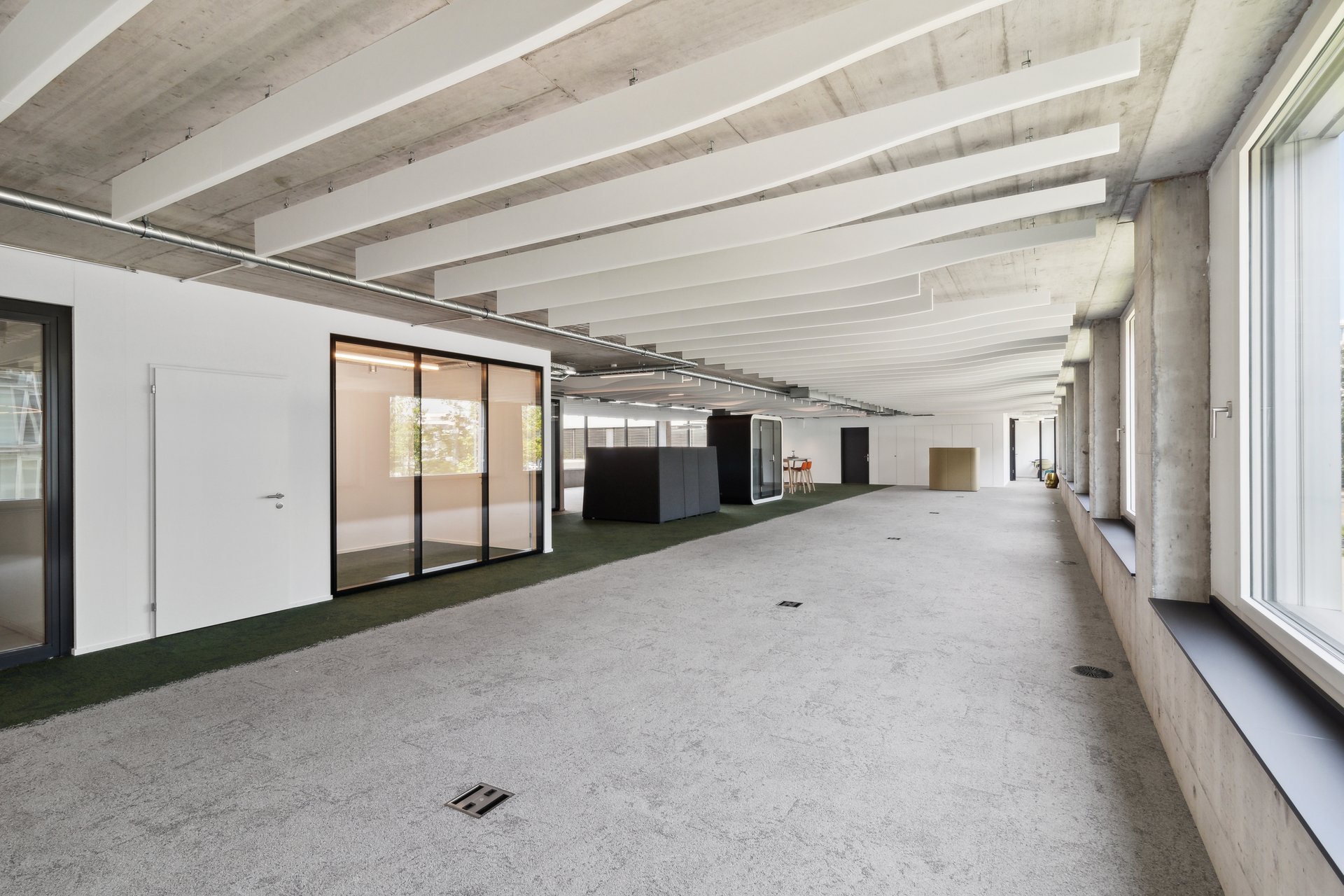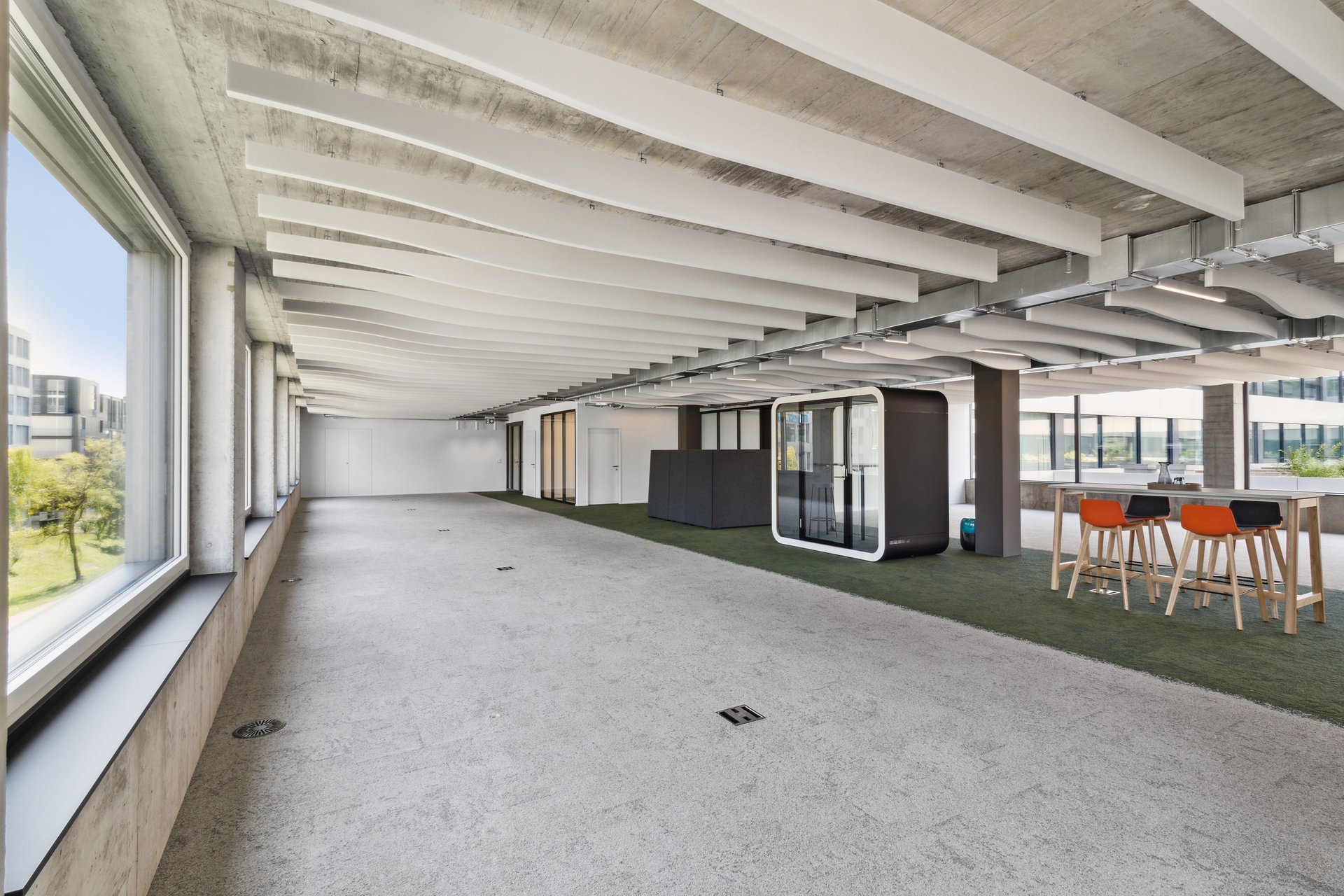 All spaces have a wired raised floor, a kitchenette and a cooled server room. All you have to do is bring your own furniture. And thanks to ventilation and cooling, your team will always work in optimal room conditions. Large windows offer a view to the outside and provide all areas with plenty of daylight. For an atmosphere that promotes creativity and productivity.